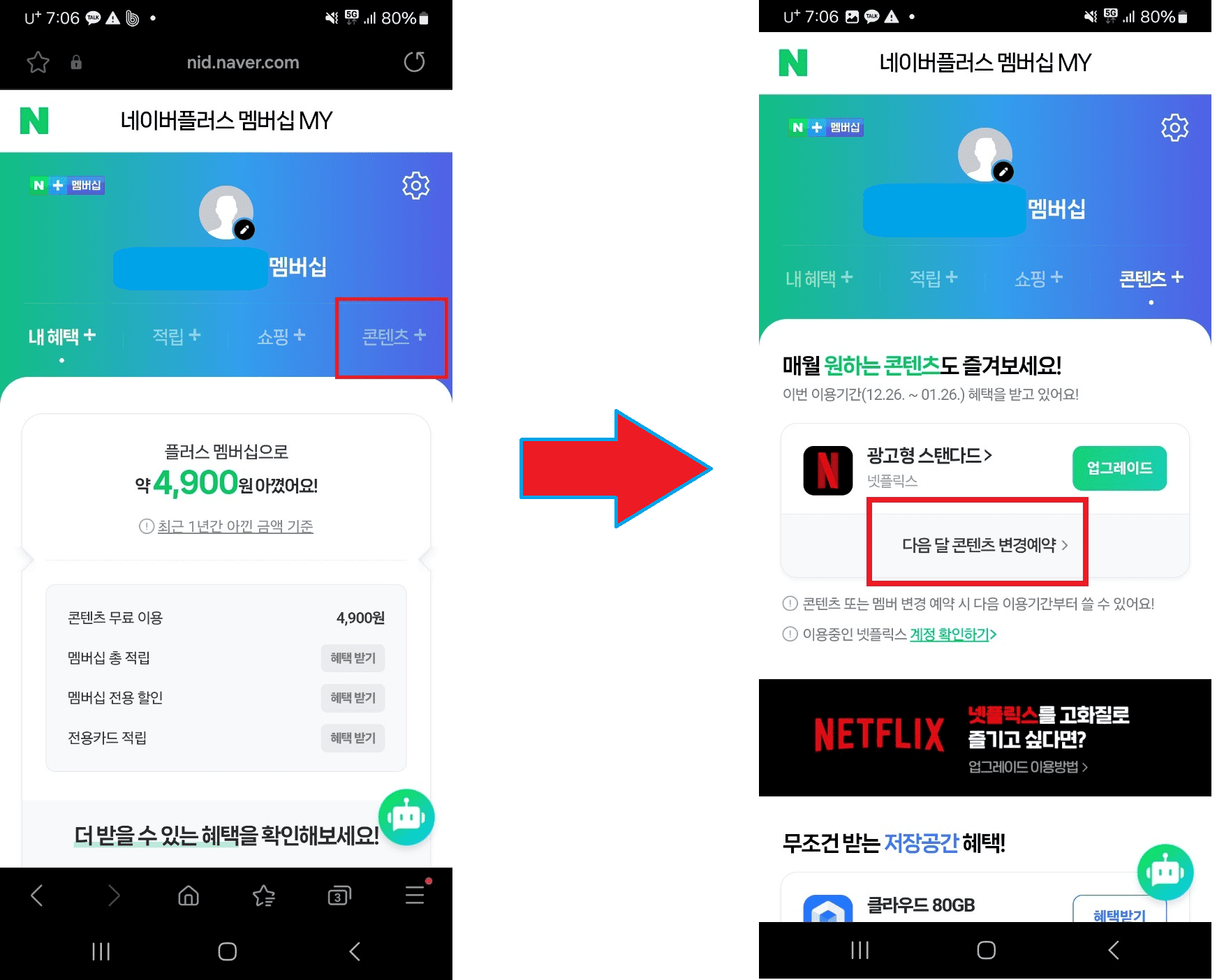 - 네이버플러스 멤버십 MY에 들어가 콘텐츠+를 클릭하세요.