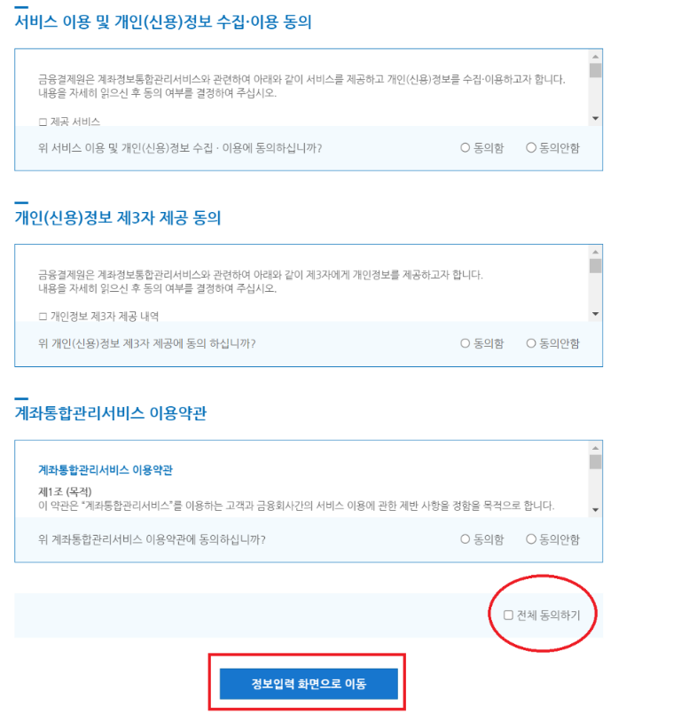 2️⃣ 개인정보 수집 이용 동의에 전체 동의 후 '정보입력 화면으로 이동'을 클릭합니다.