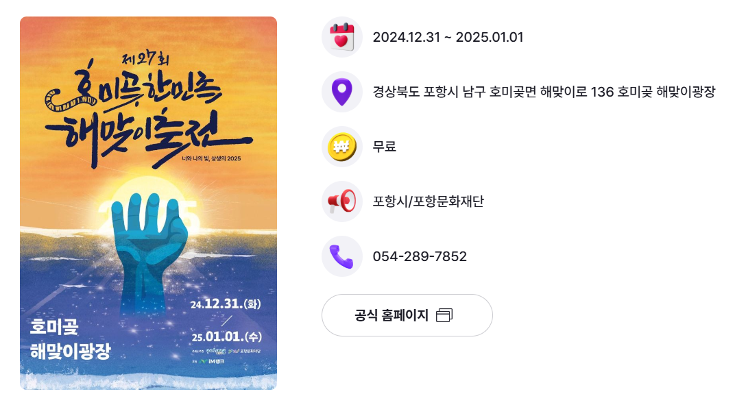 이글에서 호미곶축제의 기본정보, 무료주차장, 대중교통 정보를 확인할 수 있습니다.